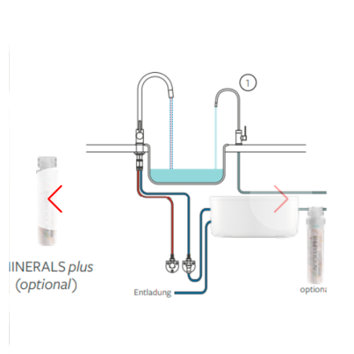 Obseg dobave: Filtrirni vložek vklj. glava filtra s priključkom ¼. Za prvo namestitev so na voljo vsi sestavni deli, kot so cev 1/4″ 115 cm, stenski nosilec z lesnimi vijaki, komplet ventilov za dovod vode, vključno z majhnimi deli.